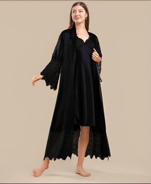 The matching robe is equally stunning, with lace panels on the sleeve and back that complement the lace detailing on the nightdress. The robe comes with a satin ribbon belt, which can be tied to cinch the waist and create a flattering silhouette.