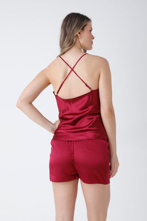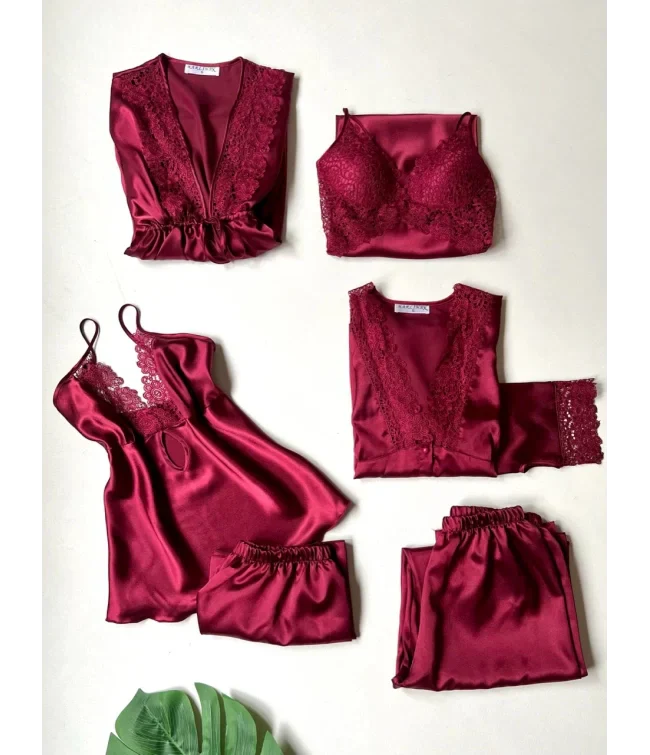 Turkish Detailed 6-Piece Satin Nightgown Dressing Gown Set Maroon