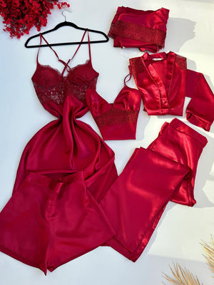 Indulge in sophistication with our 6-piece luxurious satin set  . Immerse yourself in the intricate embroidery lace detailing that adorns each piece, including a slip dress, a robe with a sash, a cami, shorts, a top, and trousers. Crafted for both comfort and a sensual, silky feel, this collection emanates an aura of opulence, promising a lavish and exquisite experience. Elevate your loungewear with this embodiment of indulgence.