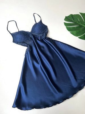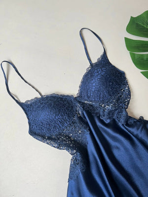 Navy Blue Guipure Detailed 6-Piece Satin Nightgown Dressing Gown Set